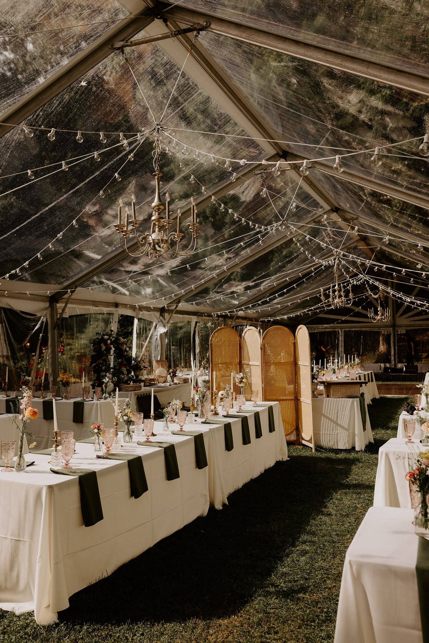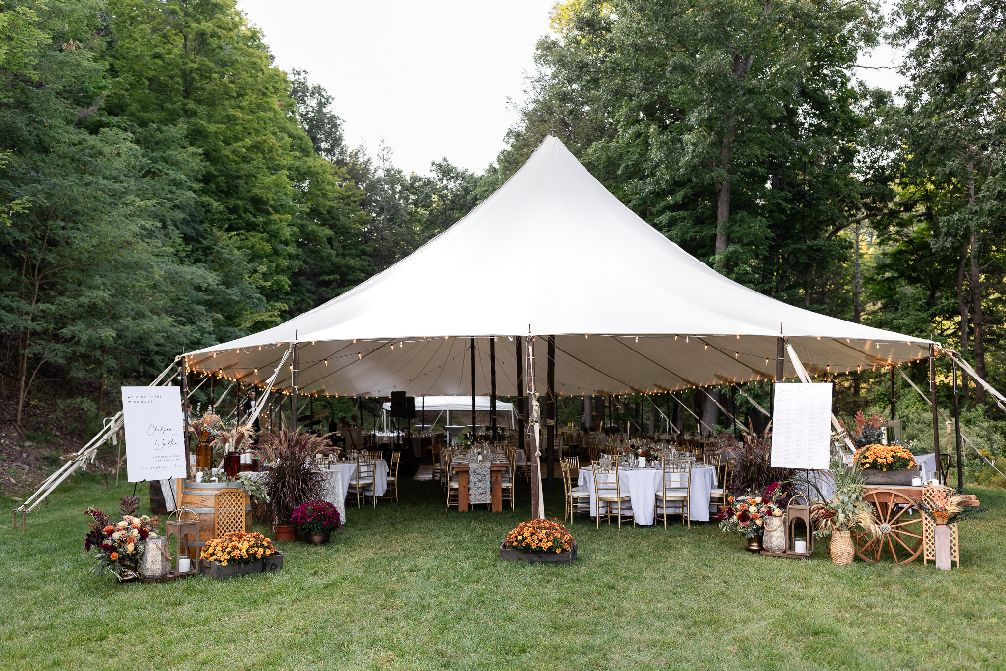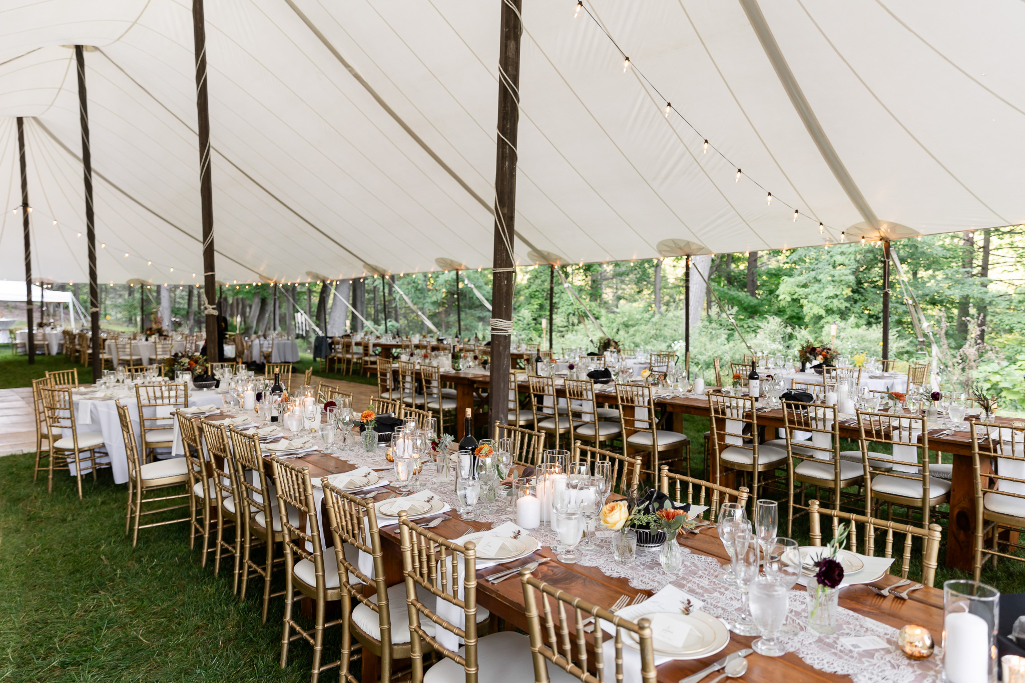 Most private home weddings require rentals like tents, tables, chairs, linens, lighting, and sometimes flooring. Many also include restroom trailers and kitchen tents to support the catering team.